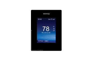 - The thermostat says “Warmup” in silver writing above the touch screen.
